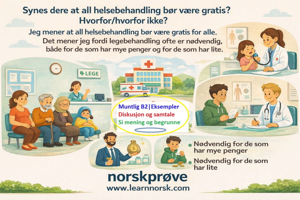 Alt i alt synes jeg det er viktig (om, selv om, at) BLANK 9 of 9 vi har et rettferdig helsesystem der alle får den hjelpen de trenger, fordi helse bør ikke være en luksus, men en rettighet.For å få tilgang til hele kurset og alle mulige spørsmål til muntlig B2-prøve, klikk her!