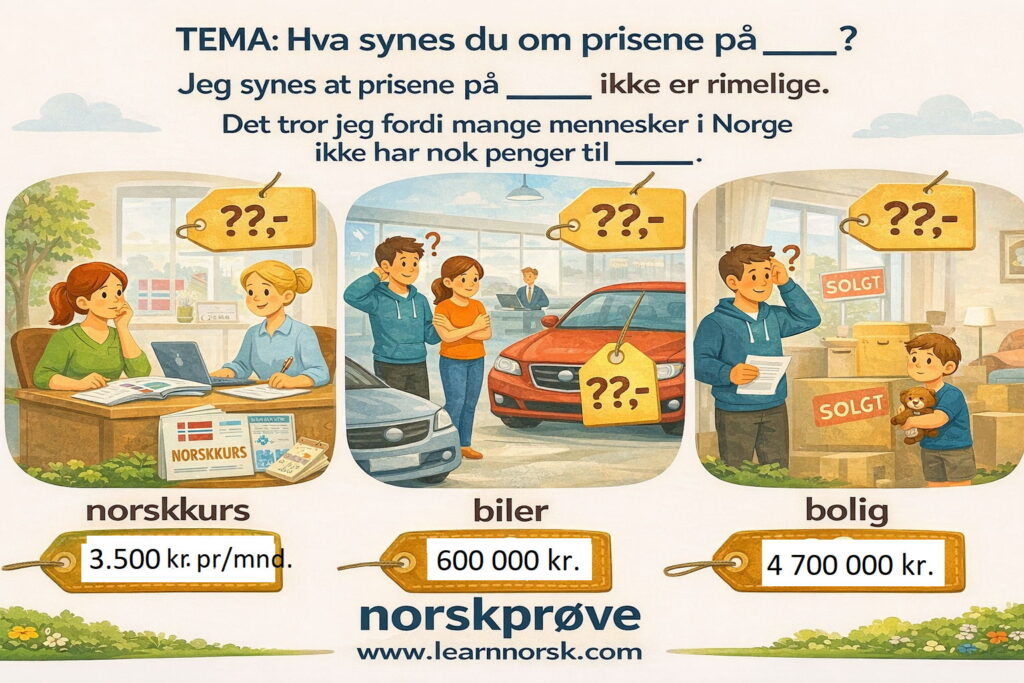 TEMA: Hva synes du om prisene på (norskkurs, klær, biler, bolig, mat, forsikring, julegaver, strøm, internett)Fill in the blank 1 of 11
